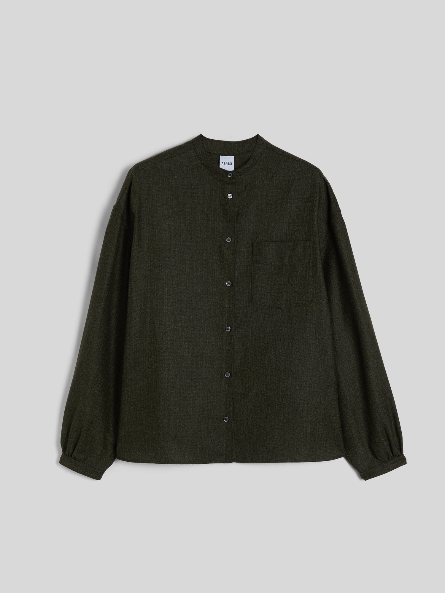 Chemise intemporelle kaki, à coupe classique, confectionnée dans un mélange luxueux de flanelle de laine, tissu technique et cachemire uni à texture subtilement irrégulière. Elle se distingue par son col mao raffiné, sa fermeture boutonnée pratique à l’avant et sa poche poitrine plaquée. Les manches longues légèrement tombantes sont finies par des poignets boutonnés ornés de délicates fronces, tandis que l’empiècement dos avec fronce centrale et l’ourlet arrondi viennent parfaire cette pièce sophistiquée.