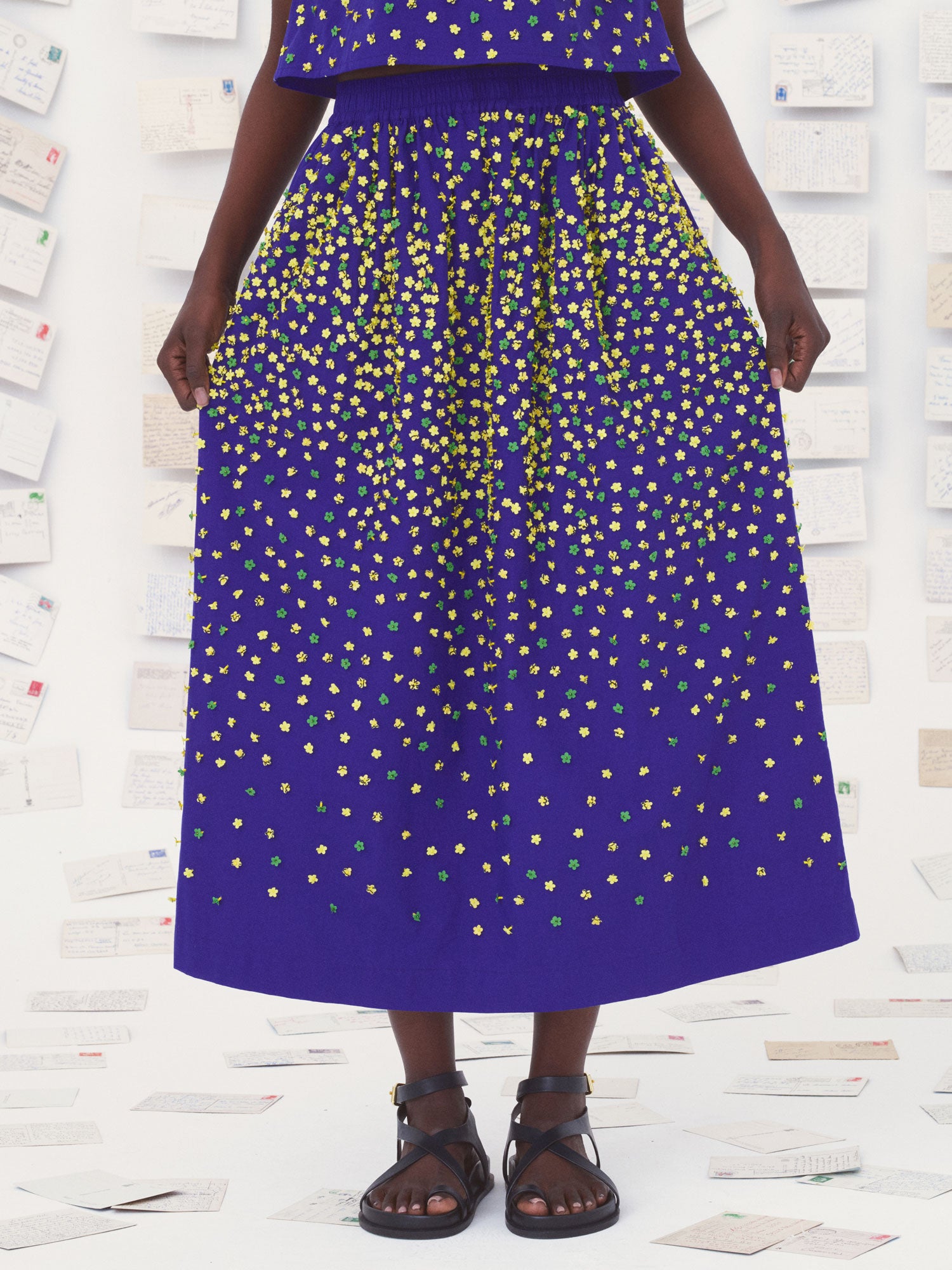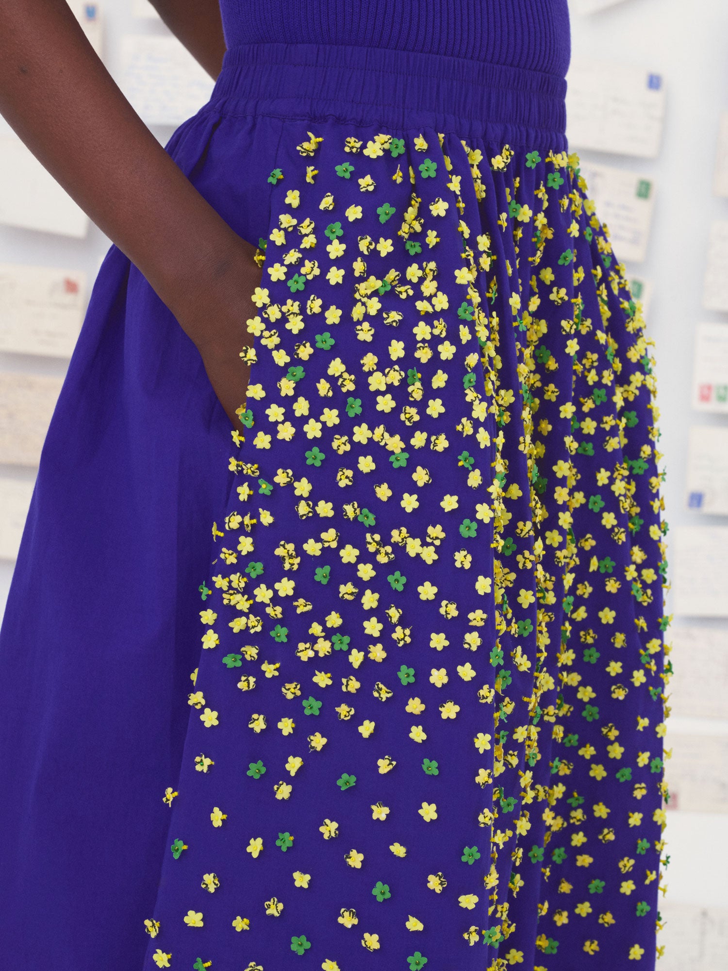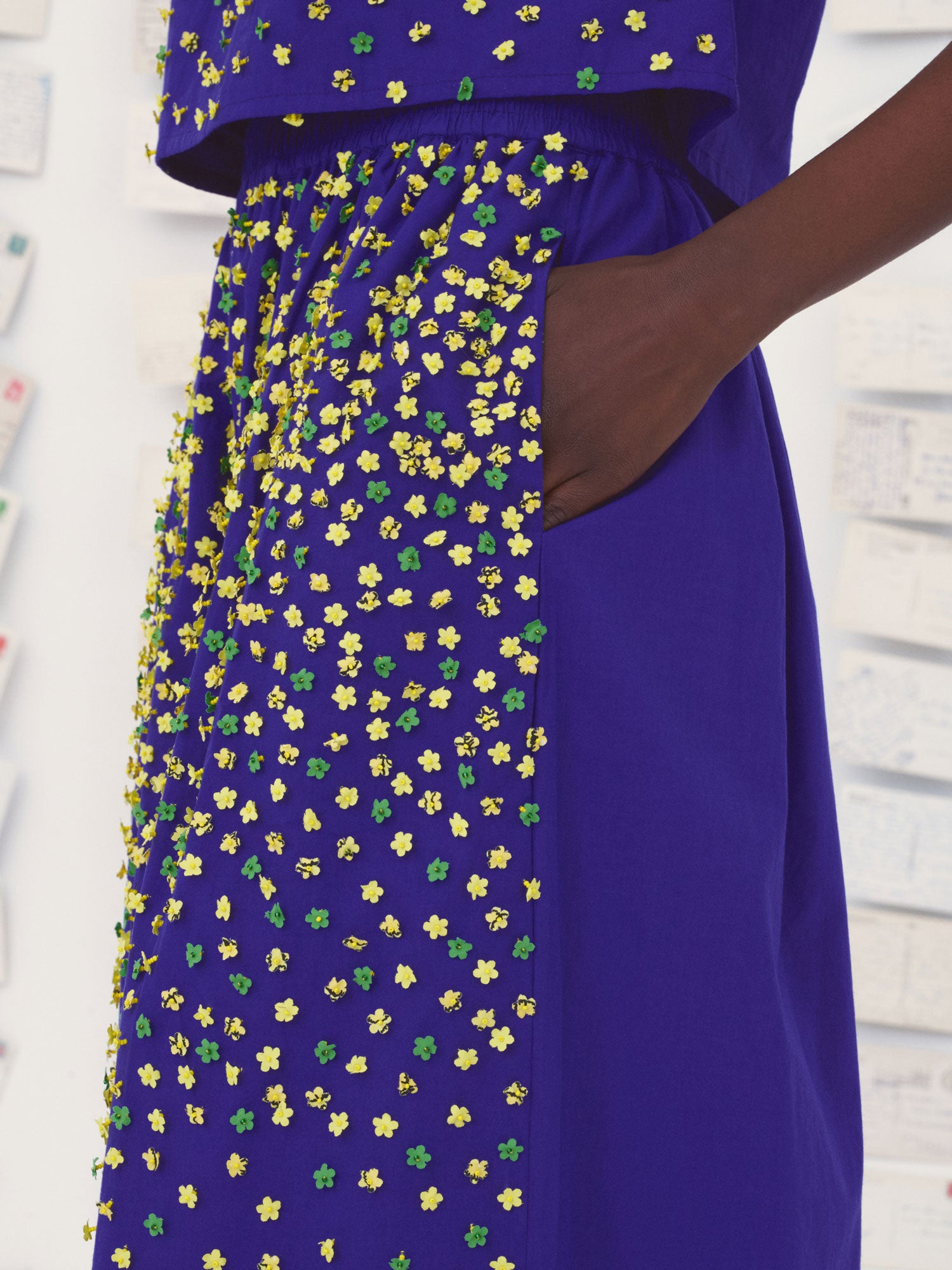 La jupe Mantou s’inscrit dans une démarche d’upcycling, mettant en valeur des fleurs délicates découpées au laser dans des tissus issus de collections précédentes. Celles-ci sont ensuite brodées à la main sur l’ensemble de la pièce, dessinant un motif évoquant un champ fleuri. Chaque fleur est soulignée par une fine tige ornée de trois perles de verre.