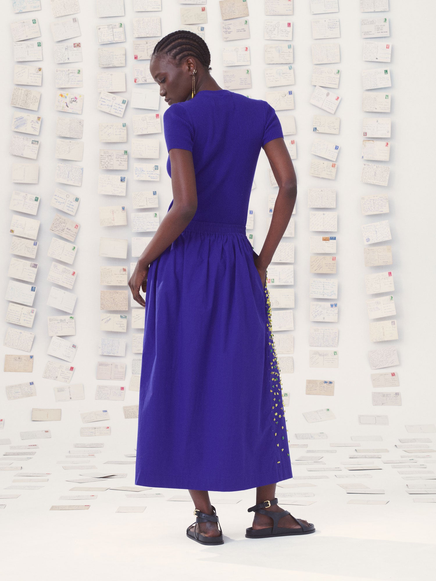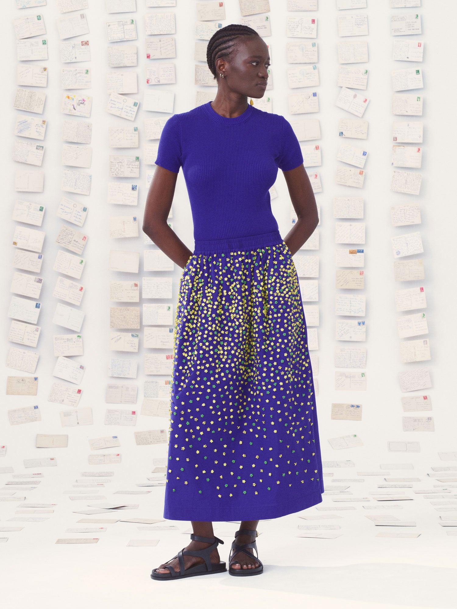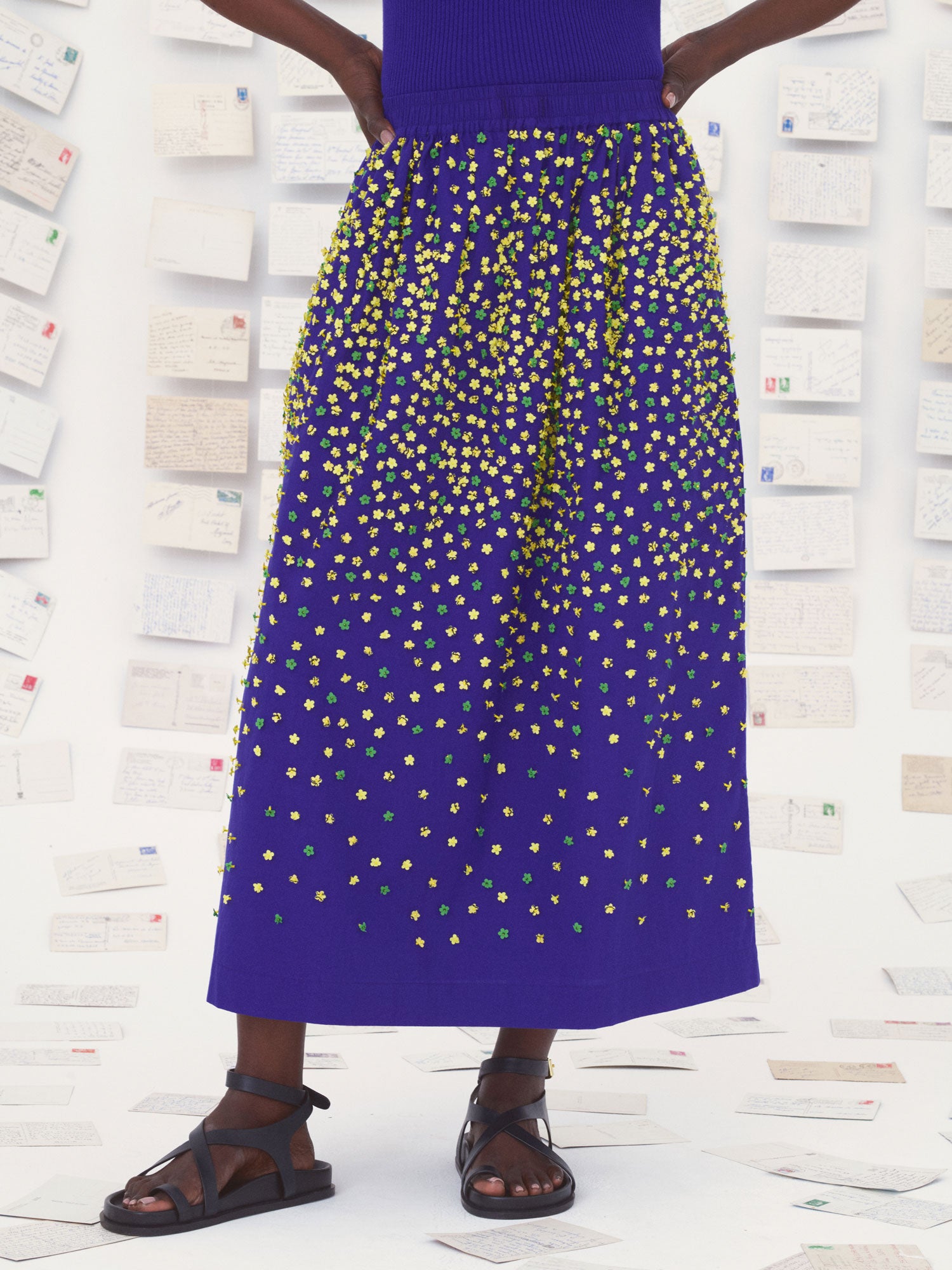 La jupe Mantou s’inscrit dans une démarche d’upcycling, mettant en valeur des fleurs délicates découpées au laser dans des tissus issus de collections précédentes. Celles-ci sont ensuite brodées à la main sur l’ensemble de la pièce, dessinant un motif évoquant un champ fleuri. Chaque fleur est soulignée par une fine tige ornée de trois perles de verre.