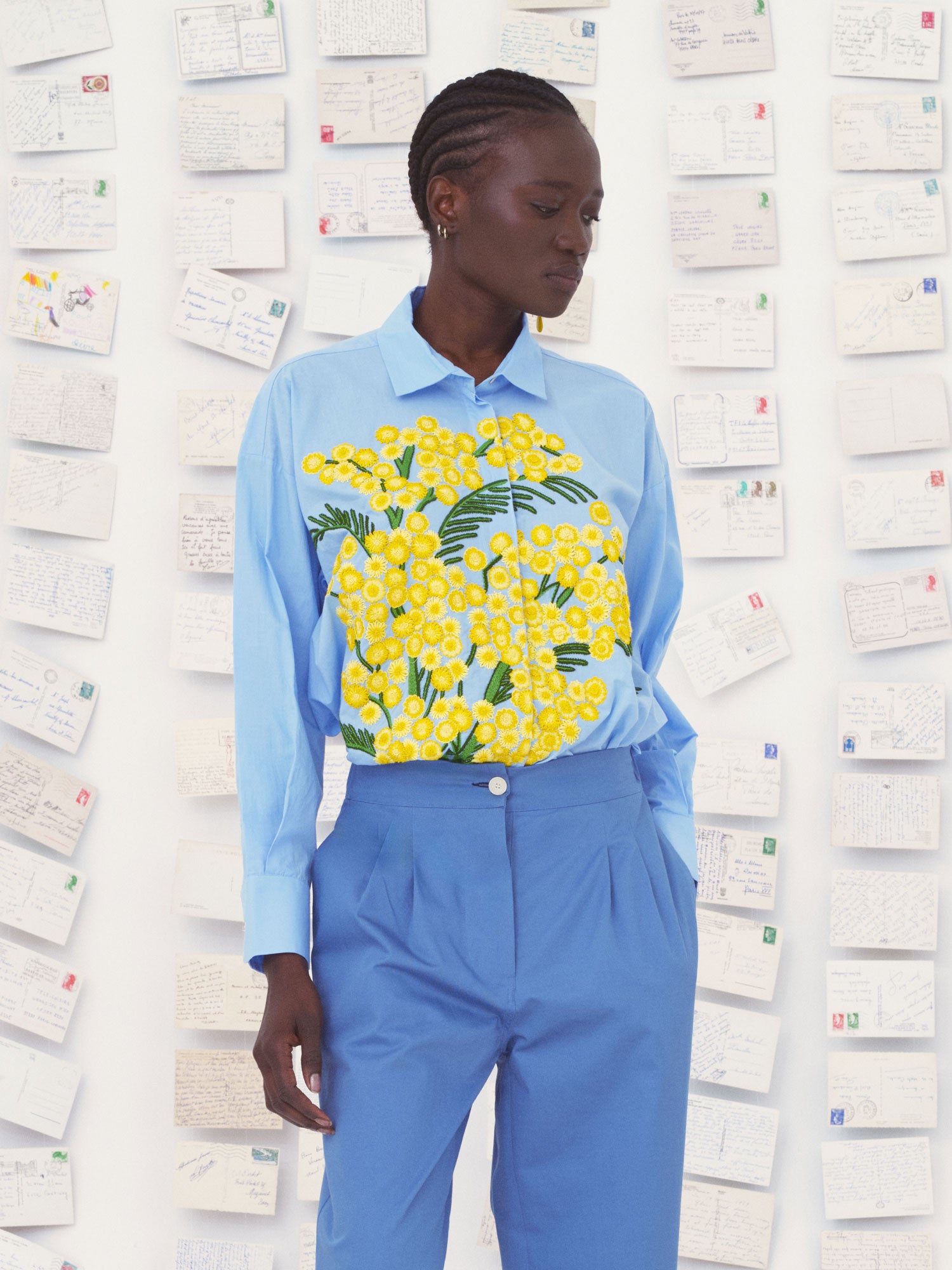La chemise Greta, réalisée en popeline de coton, met à l’honneur le mimosa, fleur emblématique et lumineuse du sud de la France. Son motif est entièrement brodé à la main, avec un travail minutieux sur chaque fleur.