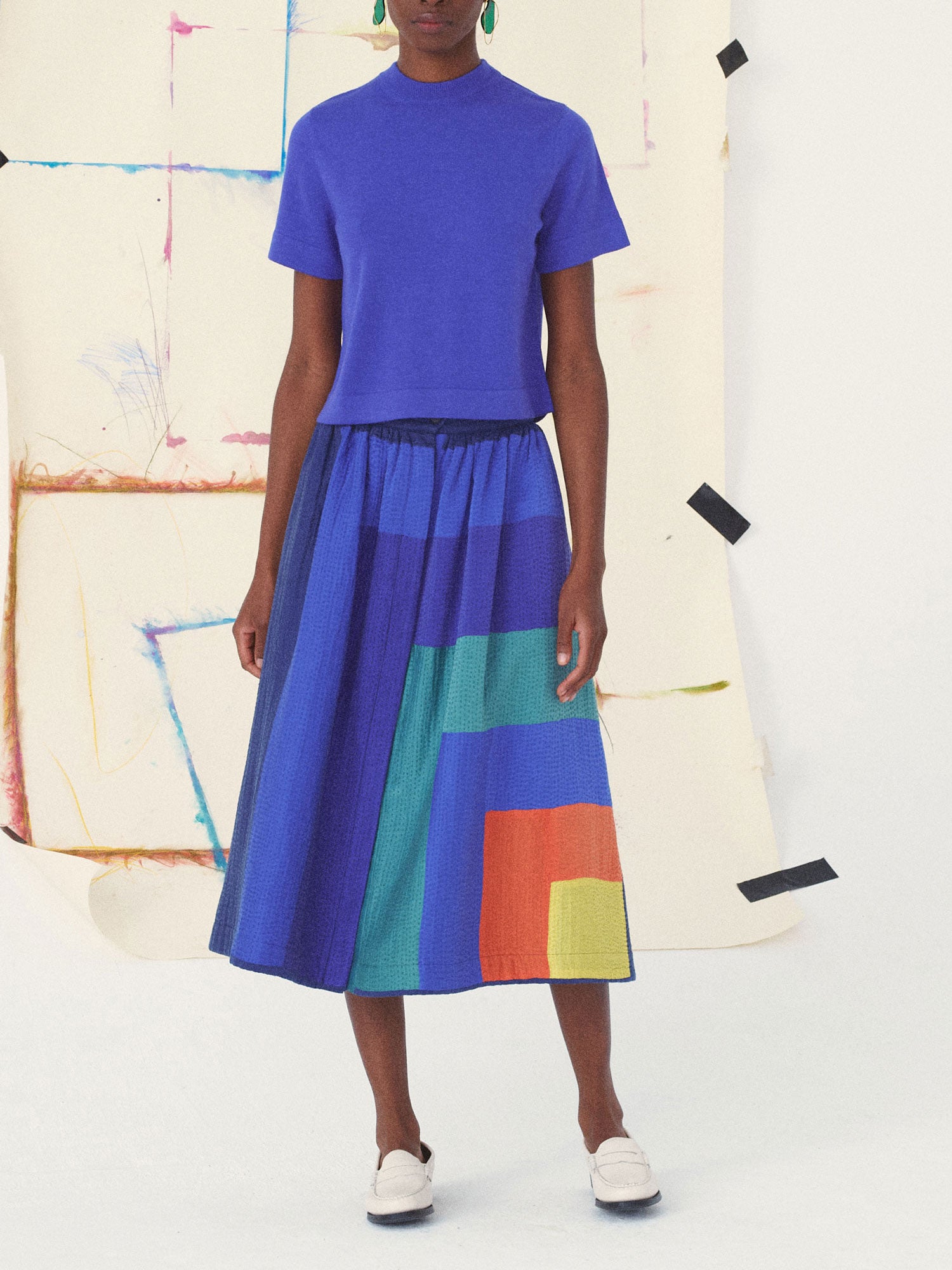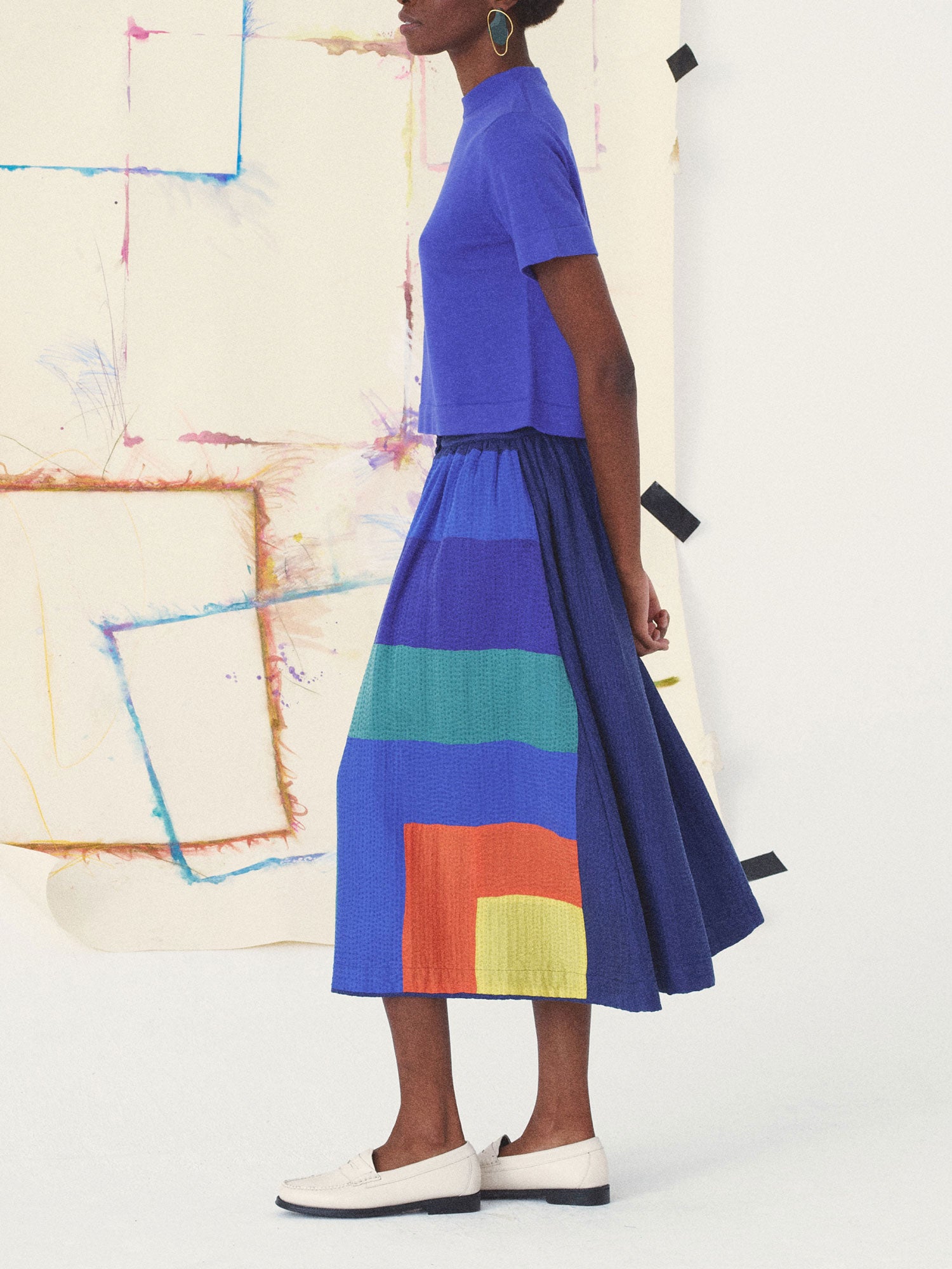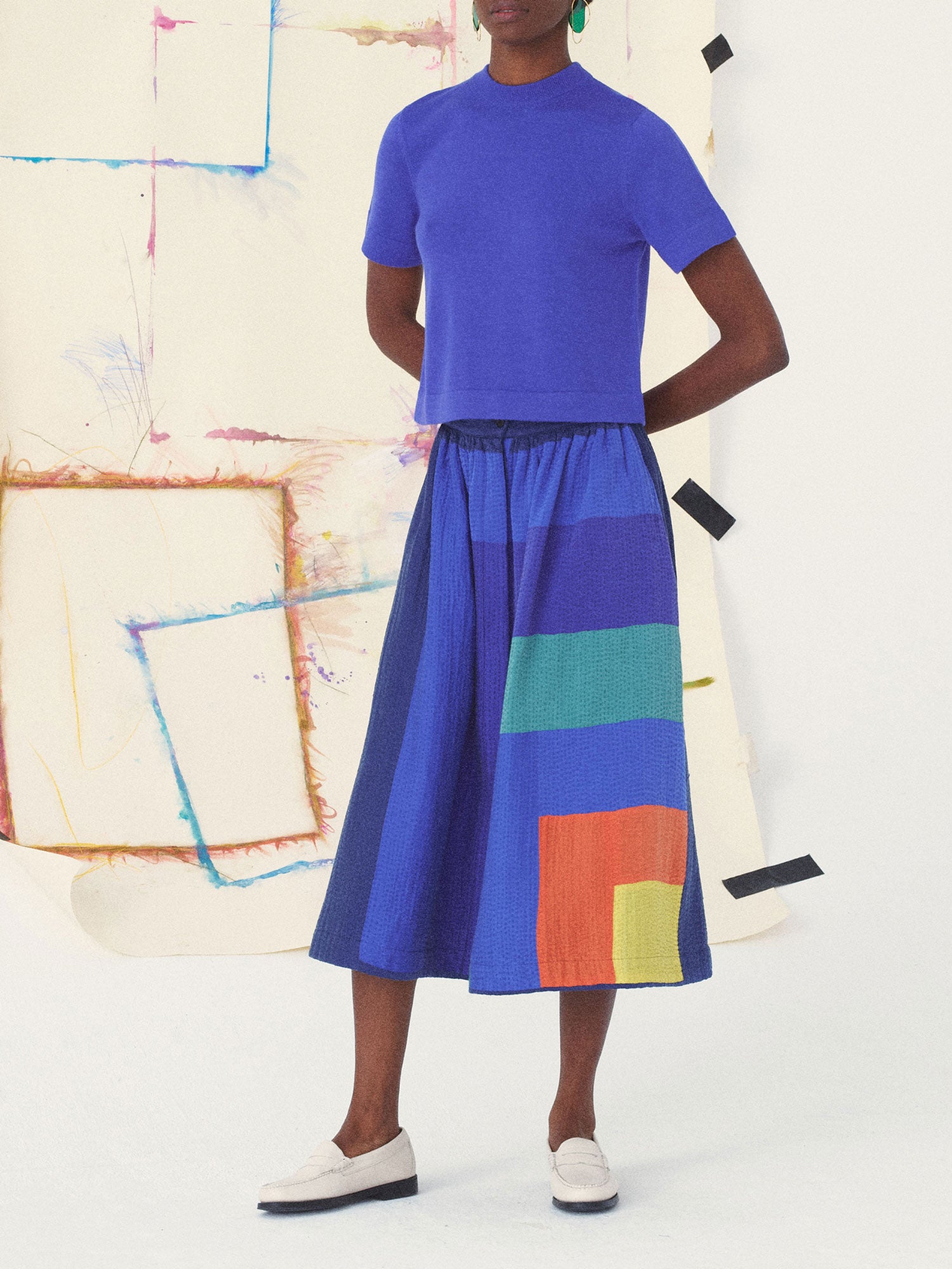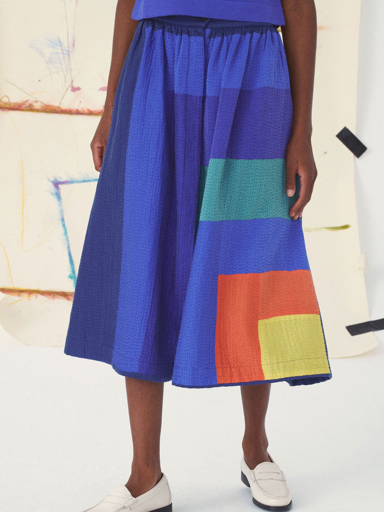 Déclinée dans des nuances de bleu, la jupe Mona se distingue par un jeu de matières sophistiqué, mêlant des patchworks de soie ton sur ton, rebrodés selon la technique du Kantha. Ces détails apportent une touche luxueuse et contemporaine à la pièce.