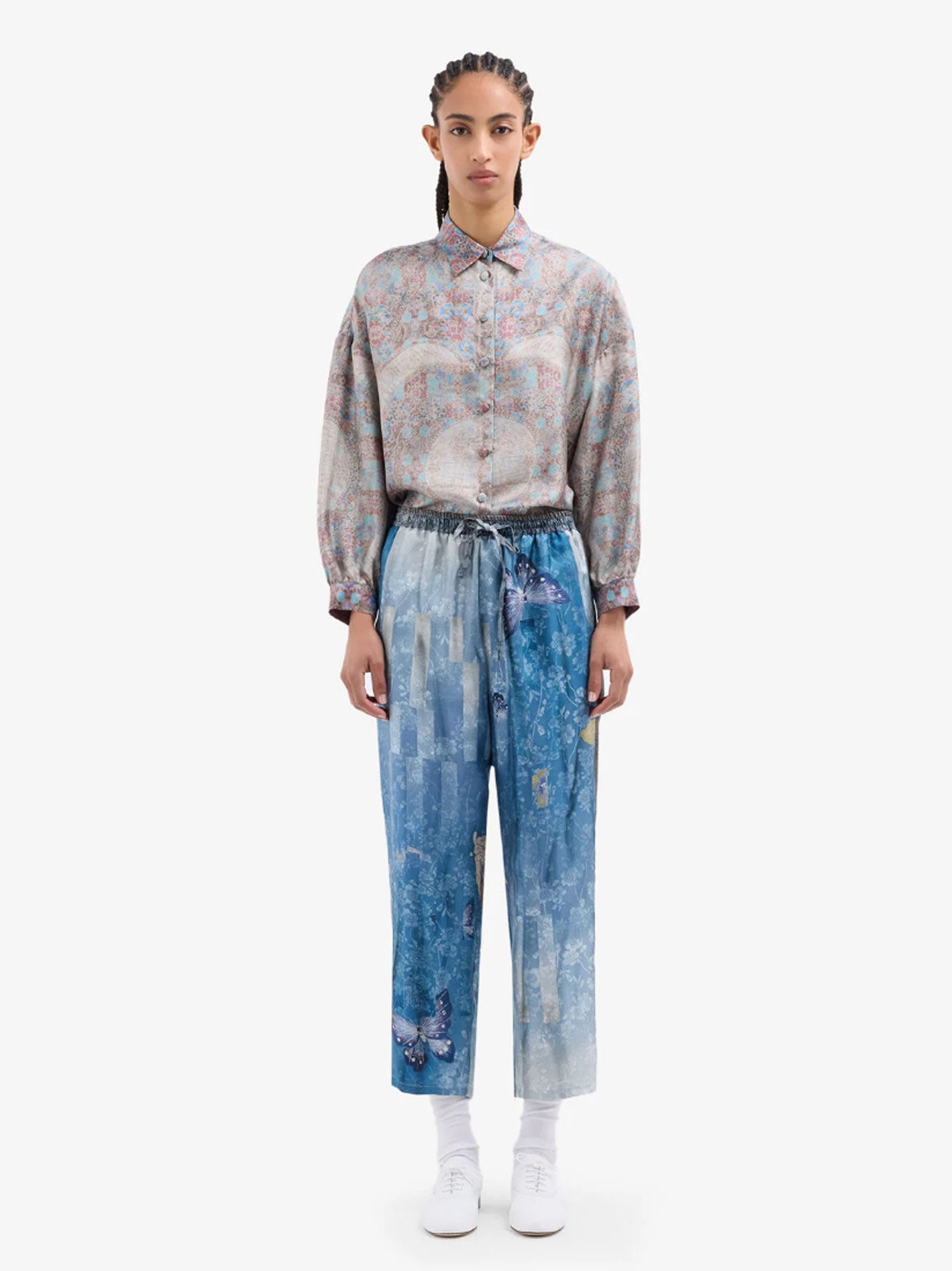 De Pierre-Louis Mascia, le pantalon en soie Aloe - Sky Blue incarne une élégance tranquille grâce à sa silhouette fluide et décontractée. Confectionné dans une soie luxueuse, ce pantalon lounge présente un dégradé de bleu apaisant rehaussé de délicats motifs de papillons, créant une esthétique poétique et raffinée. Doté d’une ceinture élastique confortable, il allie aisance et sophistication - parfait à associer avec un chemisier simple pour mettre en valeur son motif complexe.