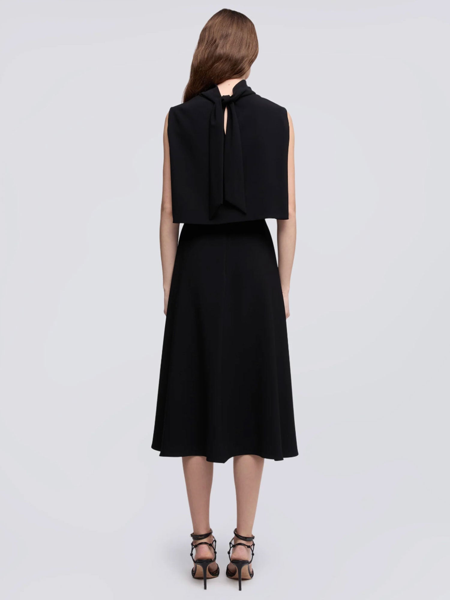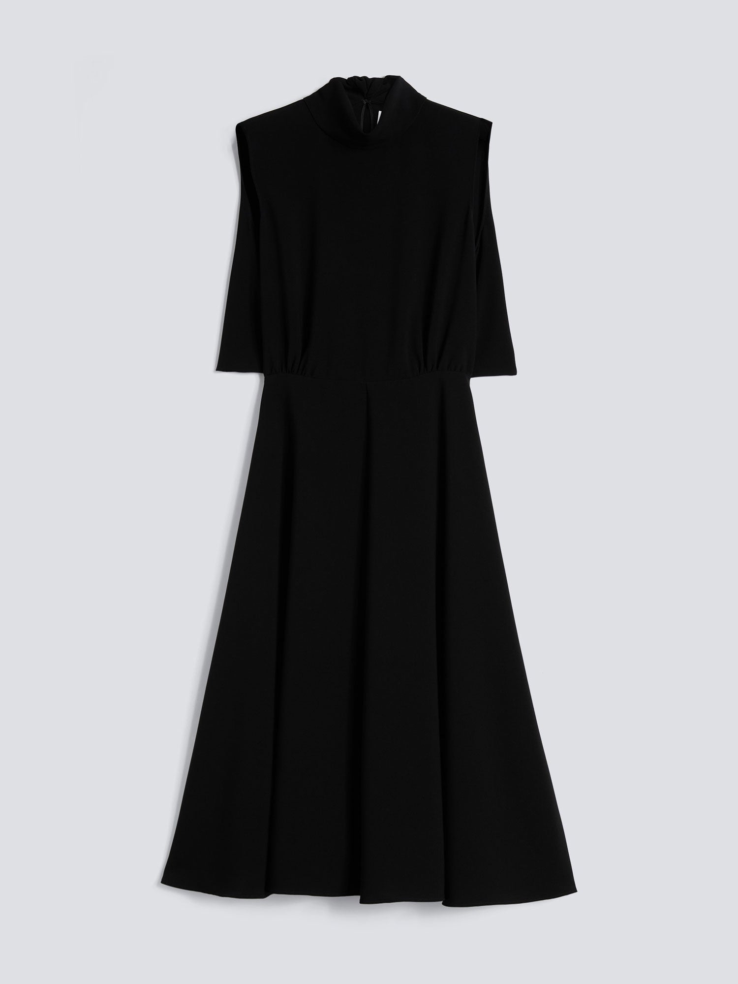 La robe ABITO - NOIR présente un col drapé avec fermeture par nœud au dos, sans manches. Le corsage arrière détaché crée un effet cape, tandis que la jupe évasée est fermée par une fermeture éclair au centre du dos. Coupe régulière pour un confort et une élégance naturelle.